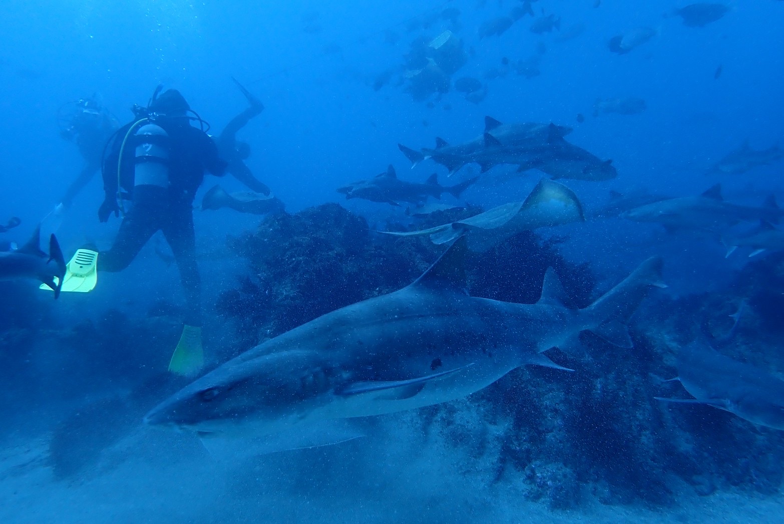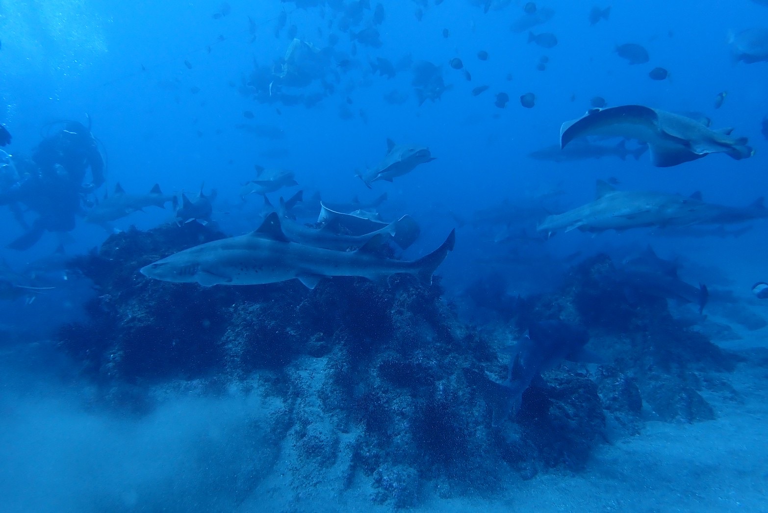 見ていただくとわかるように右も左も、上も下もサメだらけ(サメのまたくぐり。なんか御利益ありそう)! こんなに近くて大迫力だけど、こちらがなにもしなければ襲われることもないのでご安心して潜れます!!