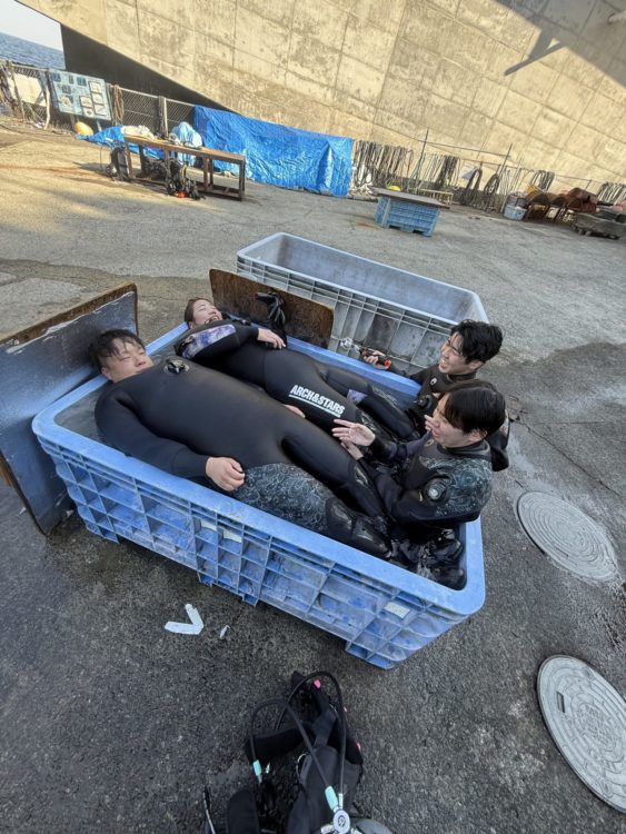 お風呂も入ってましたよ(笑)こんなにスーツに空気入っていると、体浮いちゃいますね(笑)空気入ってない2人狭そう・・・(笑)
