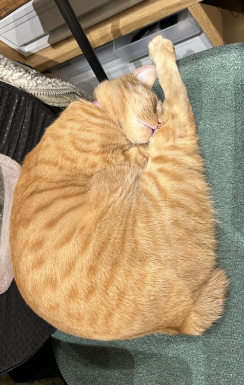 すんごい体勢で寝てました(笑)今日も元気よく鳴いてます🐈